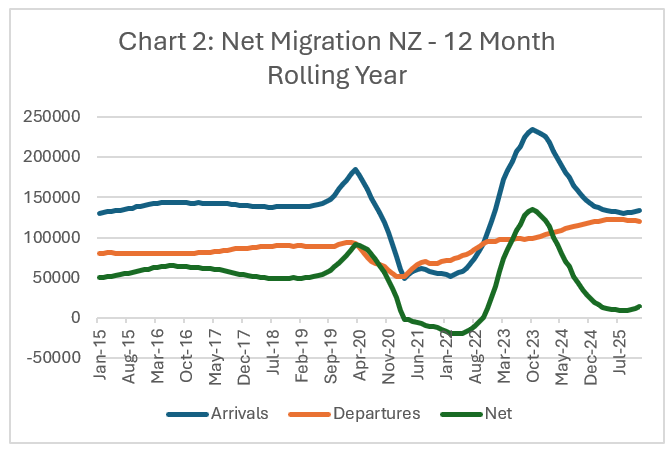 Net migration fell to around 10,000 through most of 2025 with record numbers of NZ citizens leaving (see Chart 2). While this did result in housing rents in NZ falling marginally in 2025 (negative 0.5 per cent), the NZ Government is now loosening immigration policy, particularly in terms of overseas students.