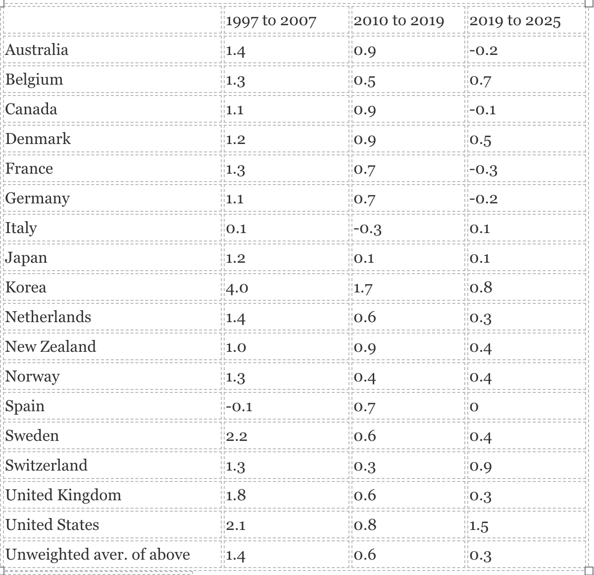 As Table 1 shows, however, the slowdown in productivity growth has affected all the developed economies to much the same extent. Australia’s lower rate of productivity growth in the 2010s and stagnation since the Covid pandemic is typical of almost all other developed economies.
