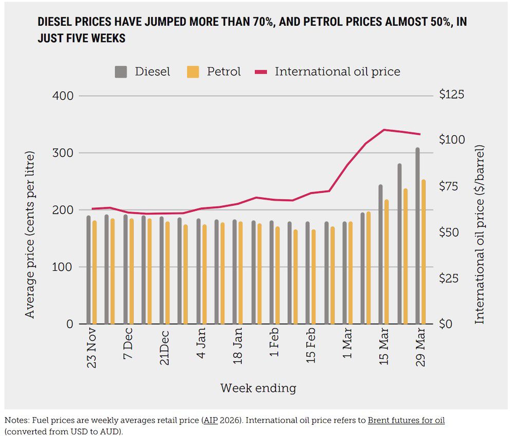 Meanwhile, consumers with petrol and diesel vehicles are feeling the pain of a far-flung global conflict. In March alone, the report says, the Iran invasion-driven increase in fuel prices cost Australians more than $1.05 billion in increased costs at the pump.