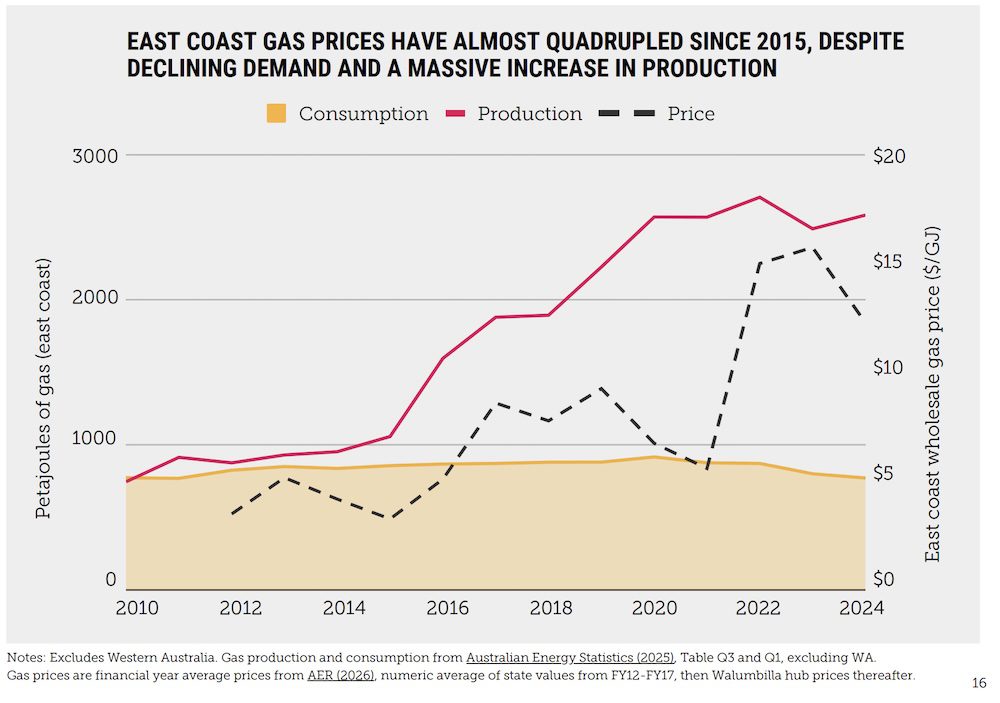 “Australia already produces five times more gas than we need,” the report says. But “since we started exporting gas from the east coast, gas prices have almost quadrupled. This is despite declining production almost tripling, and demand falling 10 per cent.