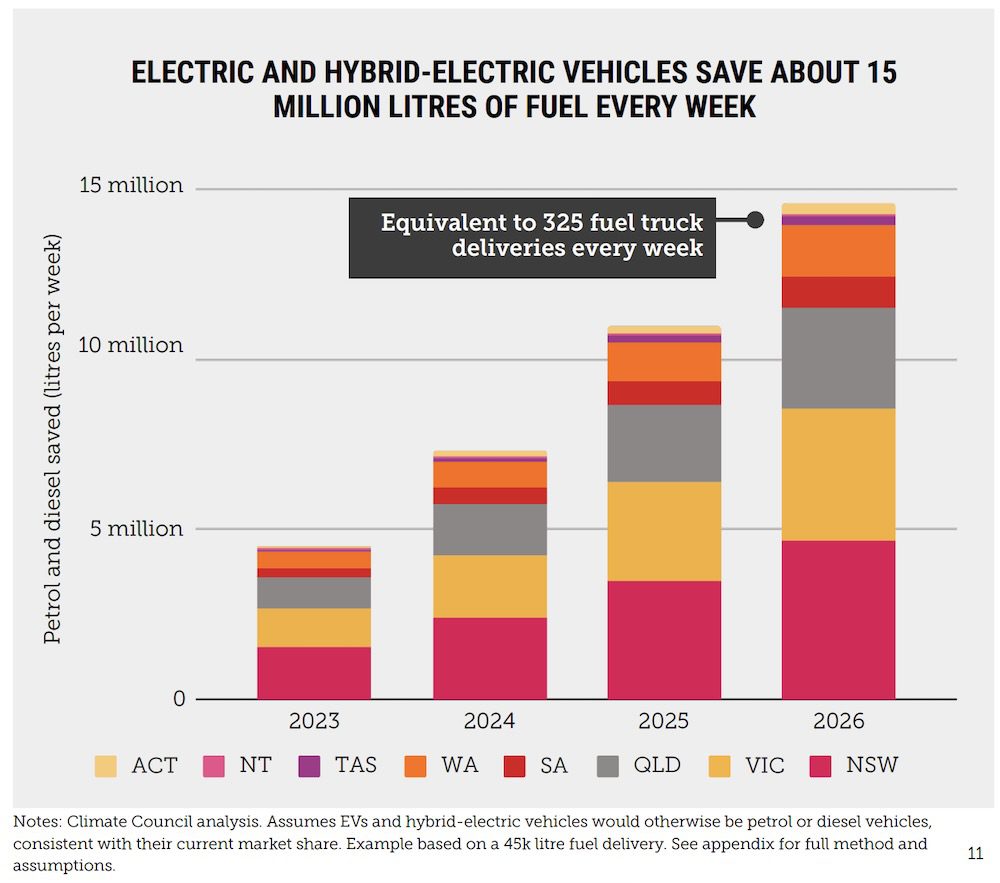 According to the Climate Council report, Australia’s current fleet of almost 1.3 million fully-electric or hybrid-electric cars, utes and vans – comparatively small though it is – reduces national use of petrol and diesel by almost 15 million litres every week.